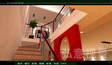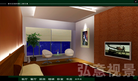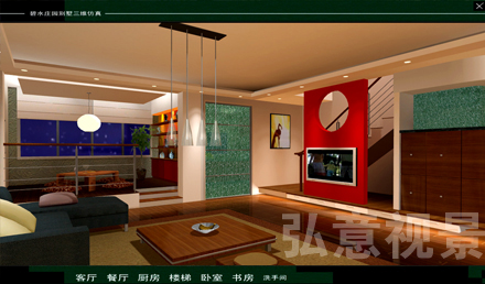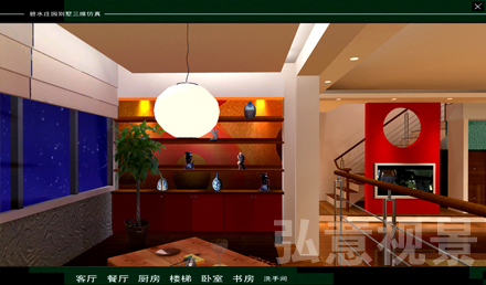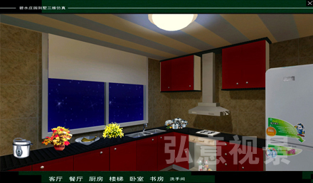 弘意制作人員在模型上使用單片建模方式,模型用的是簡模,由于空間小,裝飾品多,而且要突出表現(xiàn)材質(zhì)與燈光效果,所以在模 型制作方法、色彩把握、燈光表現(xiàn)上要比室外難得多。只有把技術(shù)和感覺容在一起才能做出上層的作品。同時(shí)這個(gè)作品還加入了打開 電視機(jī)、開關(guān)水龍頭、打開煤氣等虛擬現(xiàn)實(shí)交互功能。